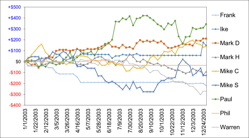 | 18‑Dec‑2003 | ‑$3.00 | ‑$8.00 | ‑$12.00 | +$46.00 | +$9.00 | ‑$47.00 | +$15.00 | ||||