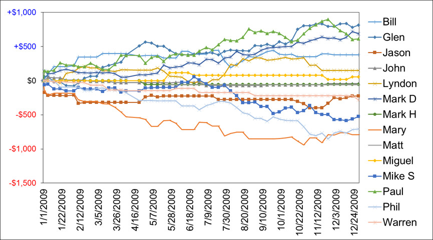 | 29‑Dec‑2009 | +$33.00 | ‑$31.00 | +$38.00 | +$9.00 | +$8.00 | ‑$62.00 | +$5.00 | |||||||||