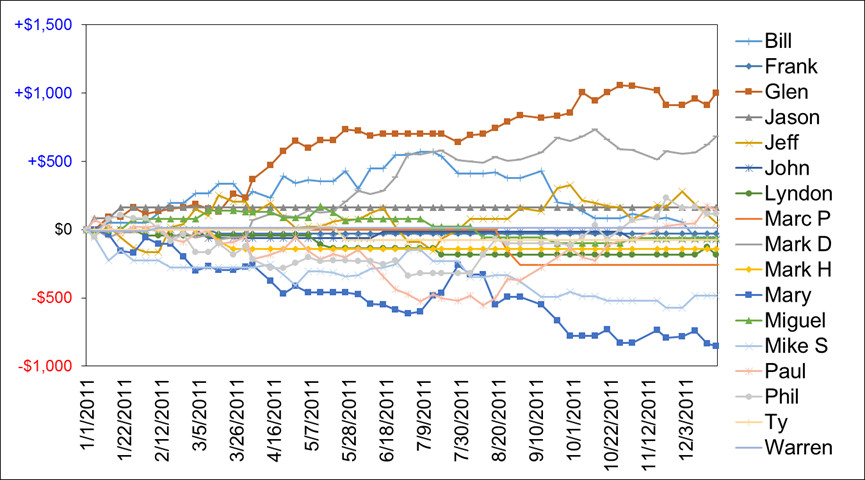 | Bill L | Frank | Glen | Jason | Jeff | John | Lyndon | Marc P | Mark D | Mark H | Mary | Miguel | Mike S | Paul H | Phil | Ty C | Warren | Jackpot | ||