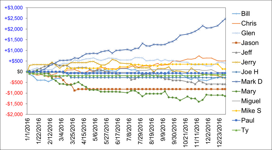 | Bill L | Chris | Glen | Jason | Jeff | Jerry | Joe H | Mark D | Mary | Miguel | Mike S | Paul H | Ty C | Jackpot | ||