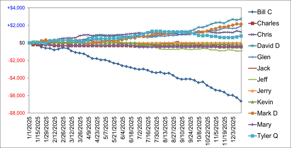 | Bill C | Charles | Chris | David D | Glen | Jack | Jeff | Jerry | Kevin | Mark D | Mary | Tyler Q | Jackpot | ||